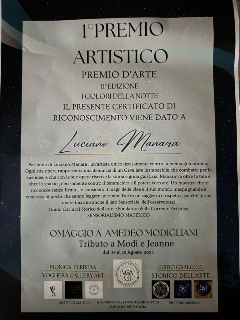 La settimana che si è appena conclusa, malgrado il periodo agostano, è stata di intenso lavoro per il famoso Maestro d’Arte fiorentino, Luciano Manara, che ha svolto due viaggi fuori città, molto impegnativi ma proficui. La prima e più lunga trasferta per il maestro, è stata quella tra il 19 ed il 20 Agosto scorsi, a Santa Margherita di Cantalice (RI) dove ha ricevuto, per la sua opera di cruda denuncia del terribile fenomeno dei femminicidi intitolata: “Mamma Perdonami” il Primo Premio della XI edizione del Premio d’Arte “I Colori della Notte” che quest’anno era dedicato ad Amedeo Modigliani ed a sua figlia Jeanne.