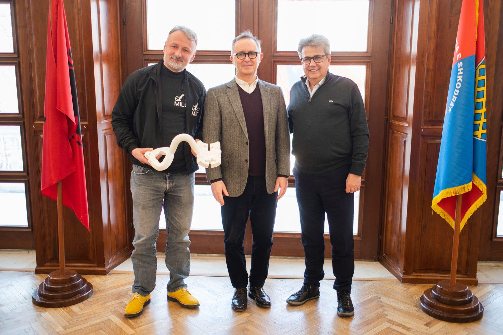 Milot, dunque, che sentiamo come un orgoglio fiorentino, vivendo come detto, da anni nella nostra città e che proprio nel suo studio a Firenze, è stato ripreso dal fotografo Michele Stanzione, nella foto sopra, con il bozzetto di questa nuova opera, sta realizzando non solo un’altra delle sue enormi sculture, che lo hanno reso, ormai, artista di fama internazionale, ma sta anche facendo divulgazione culturale di alto livello, perchè porta a conoscenza dell’opinione pubblica italiana le bellezze culturali ed artistiche dell’Albania, Paese del quale poco si conosce da questo punto di vista in Italia, mettendo in evidenza e valorizzando una città, quale Shkodra che, come abbiamo potuto scoprire dalle parole appassionate del curatore Albert Vataj, risulta essere una vera e propria perla artistica albanese. Inoltre il comunicato stampa permette di conoscere anche i nomi di coloro, che, nell’ombra dell’anonimato, lavorano per dare forma alle statue di Milot, con estrema professionalità, anche e soprattutto per garantire la posa in opera del monumento, in assoluta sicurezza per l’incolumità di tutti i suoi visitatori e dei passanti. Ricordiamo, infatti, che stiamo parlando di un’opera in acciaio Corten, che, una volta terminata ed installata, sarà lunga 20 metri, alta 10 metri e pesante quasi 16 tonnellate.
